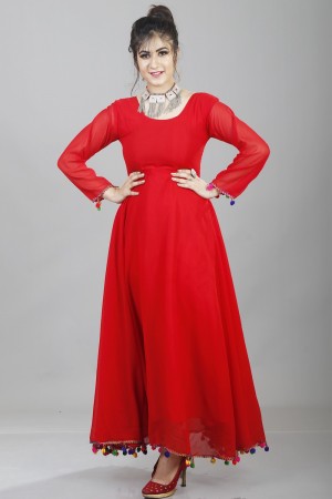 red long gown with pom pom lace